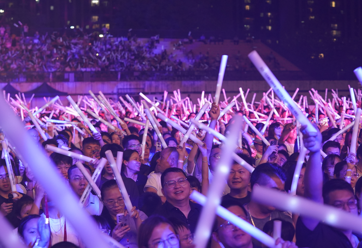 10月4日,懷集的夜空被港樂(lè)與光影共同點(diǎn)亮。梁漢文的《七友》、泳兒的《我的回憶不是我的》……那些刻在記憶里的旋律,在“夜太陽(yáng)”舞臺(tái)燈光的編織下,擁有了可視的形狀與色彩。